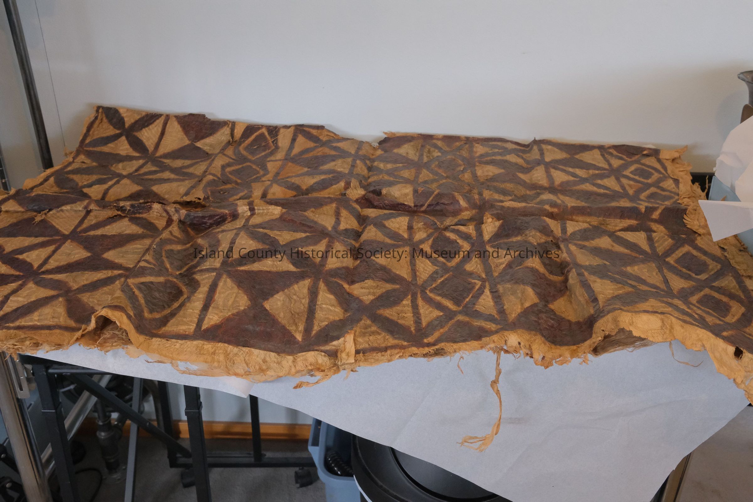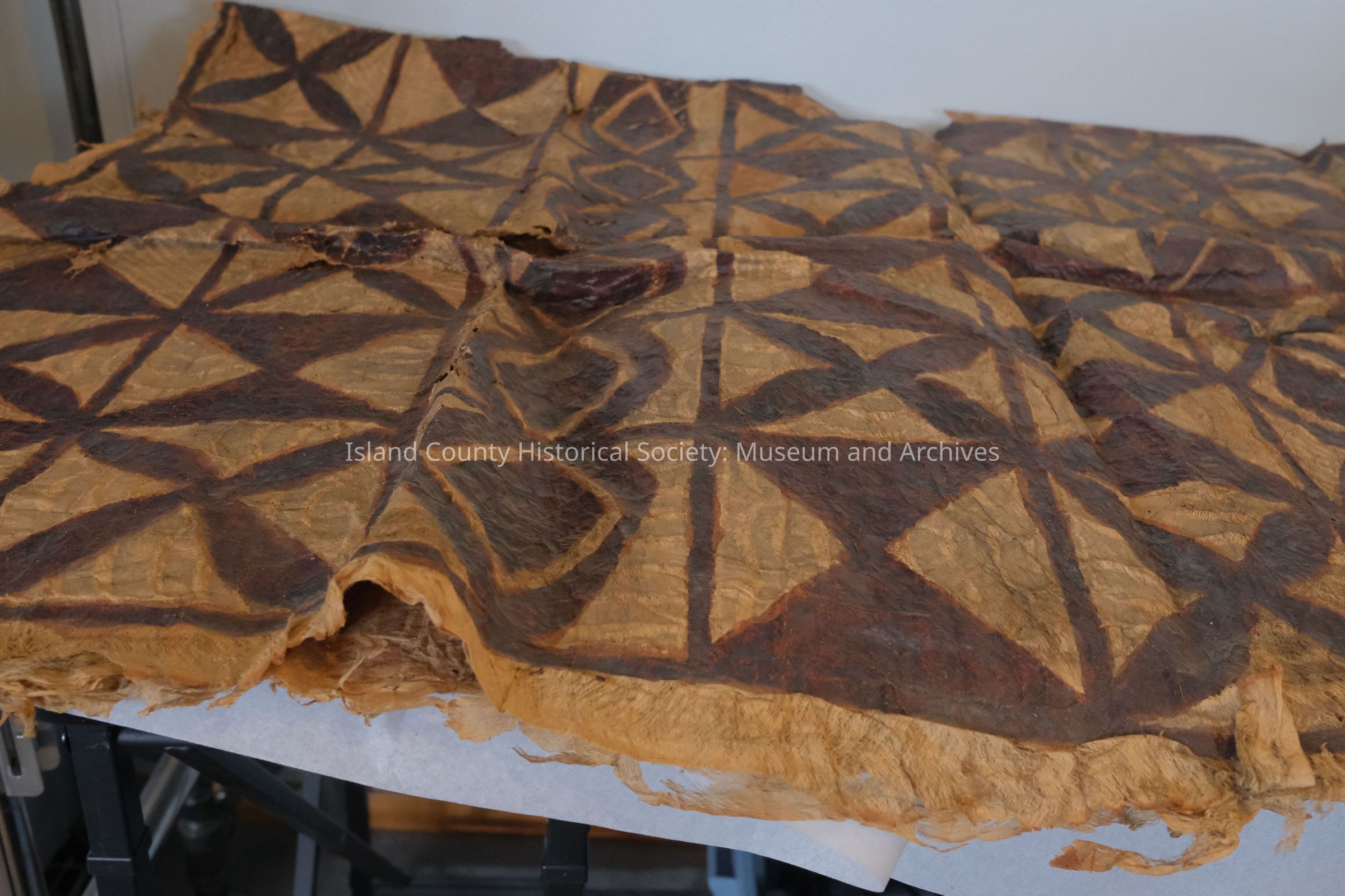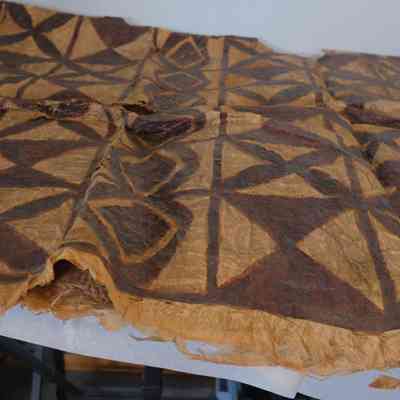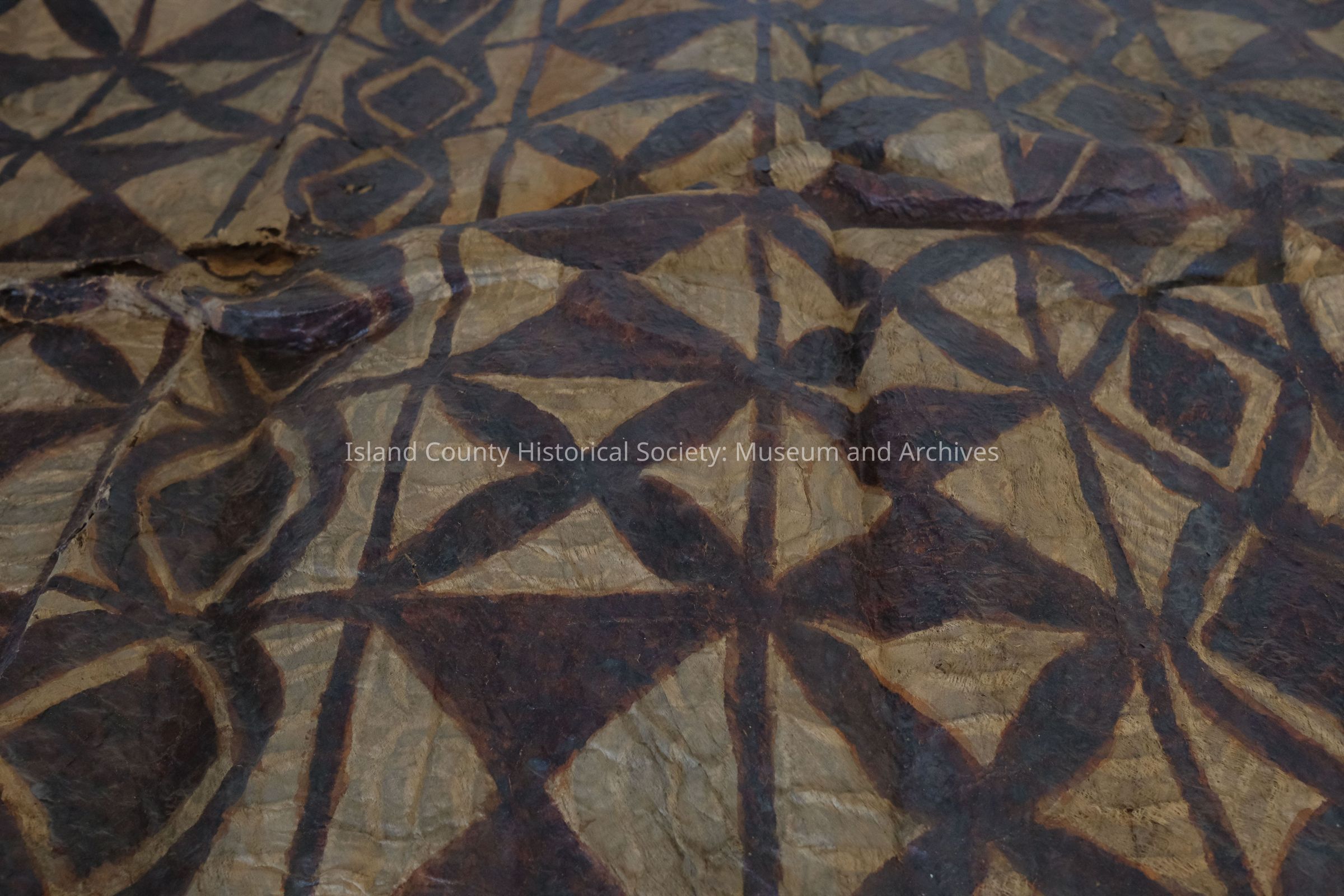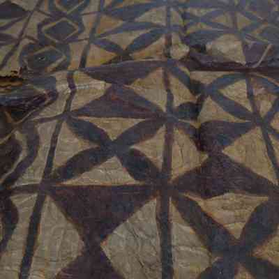 Bark cloth, or tapa, is not a woven material, but is made from bark that has been softened through a process of soaking and beating. The inner bark is taken from several types of trees or shrubs, often mulberry and fig, and designs are applied with paints and vegetable dyes of light brown, red, and black. Bark cloth is manufactured for everyday needs such as room dividers, clothing, and floor mats, as well as ceremonial uses in weddings and funerals.