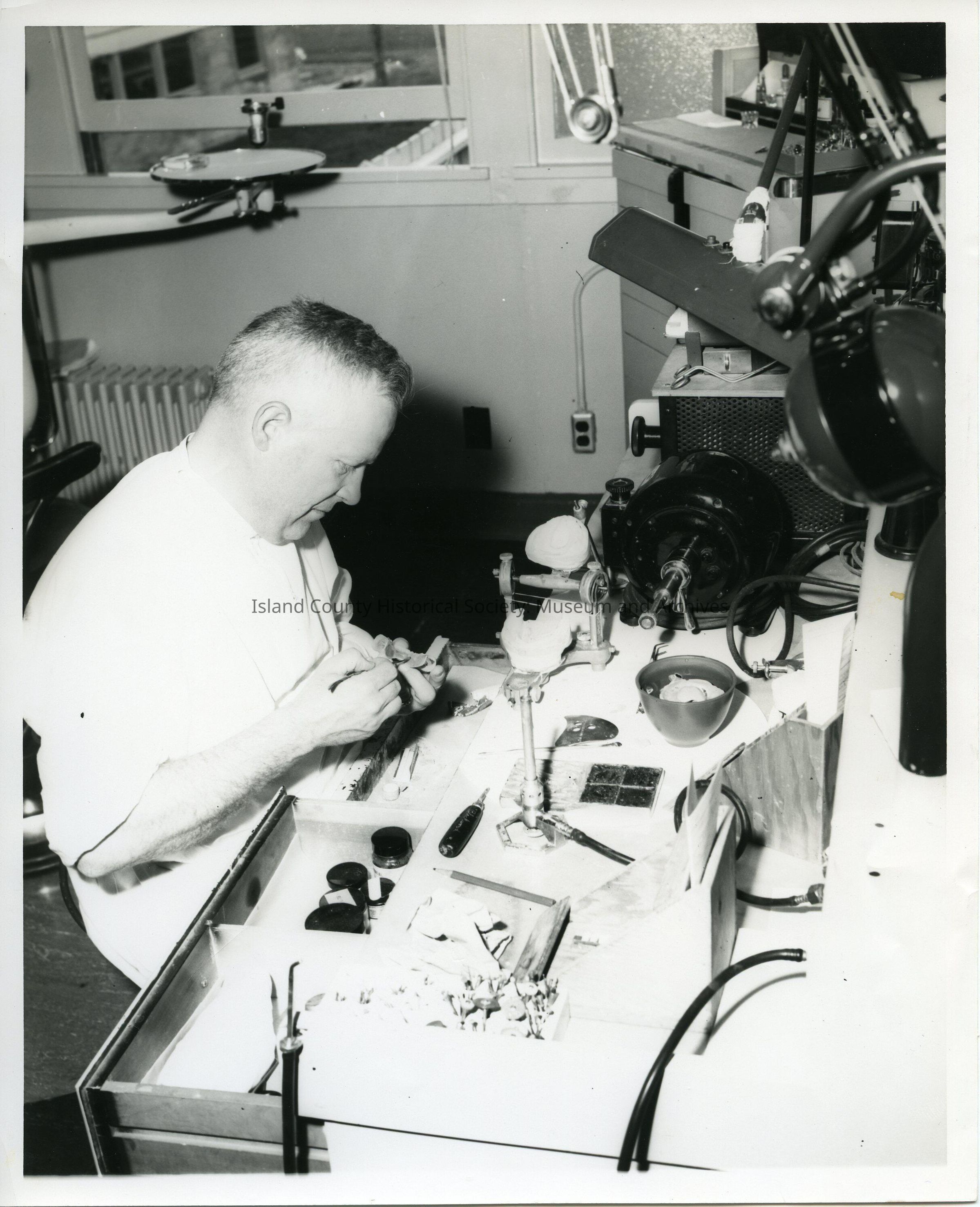 Photograph of an older man in a workshop with lights, electrical gadgets and tools. Looks like a Bunsen burner on the desk/work table.