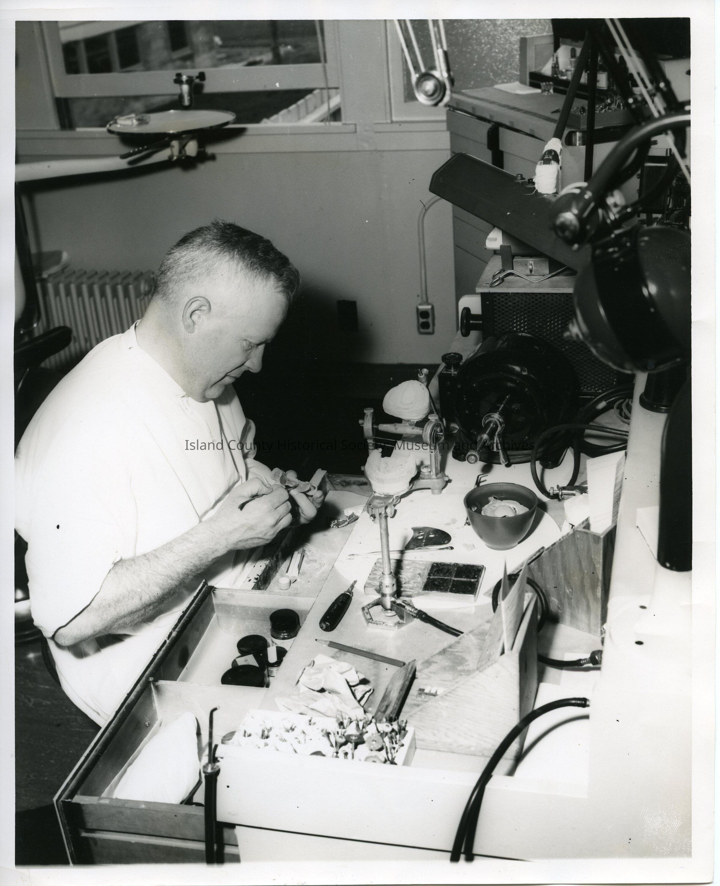 Photograph of an older man in a workshop with lights, electrical gadgets and tools. Looks like a Bunsen burner on the desk/work table.