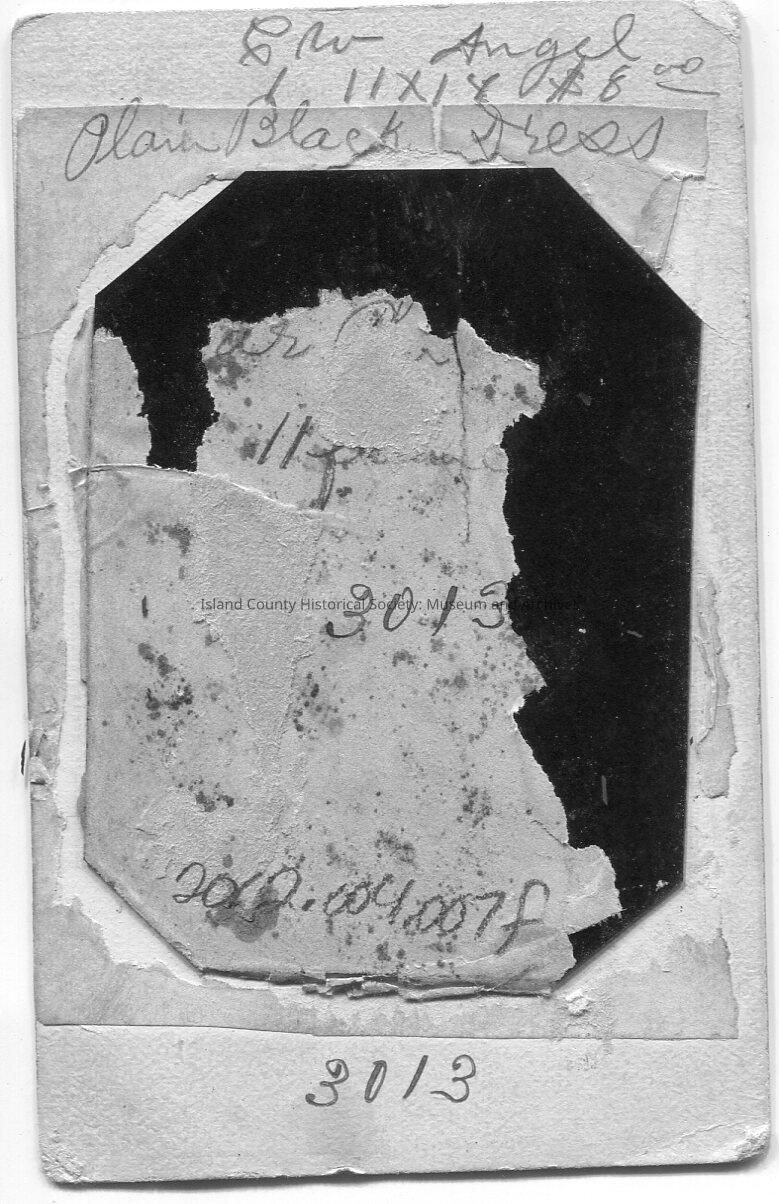 Tintype of a woman in a vertical striped dress with a white collar, dark tied ribbon under the collar. Her hair is parted in the middle and pulled back. On the back is writte 3013 and other illegible letters. On the surround (scanned and in album) was written: (3 letters) Angel 11 x 14 (or maybe 18) $8.00 plain black dress