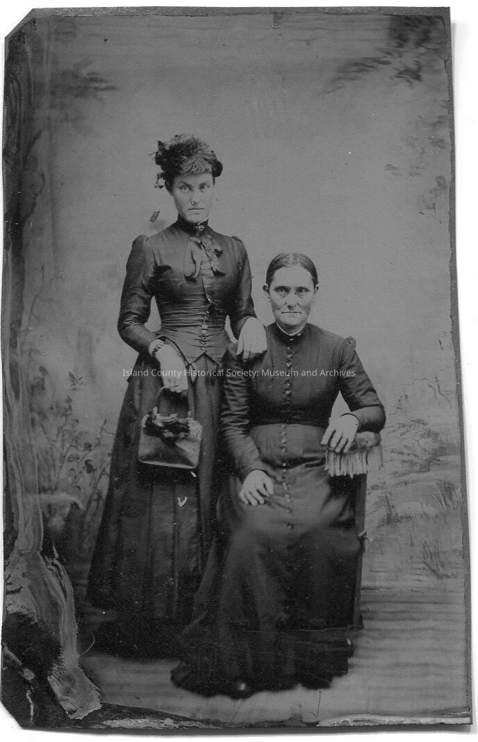 Tintype of two women, one standing on the left and the other seated on the right. The one standing appears younger (perhaps a daughter), wears a two-piece dress, hat and is holding a purse. The jacket has a high collar, slightly puffed sleeves, lots of buttons down the center front, a long ribbon tie and two points at the center of each side in front with little ribbons attached. The skirt is pleated. Her left hand is on the right shoulder of the seated woman. She is wearing a plain button-up dress with a high collar.