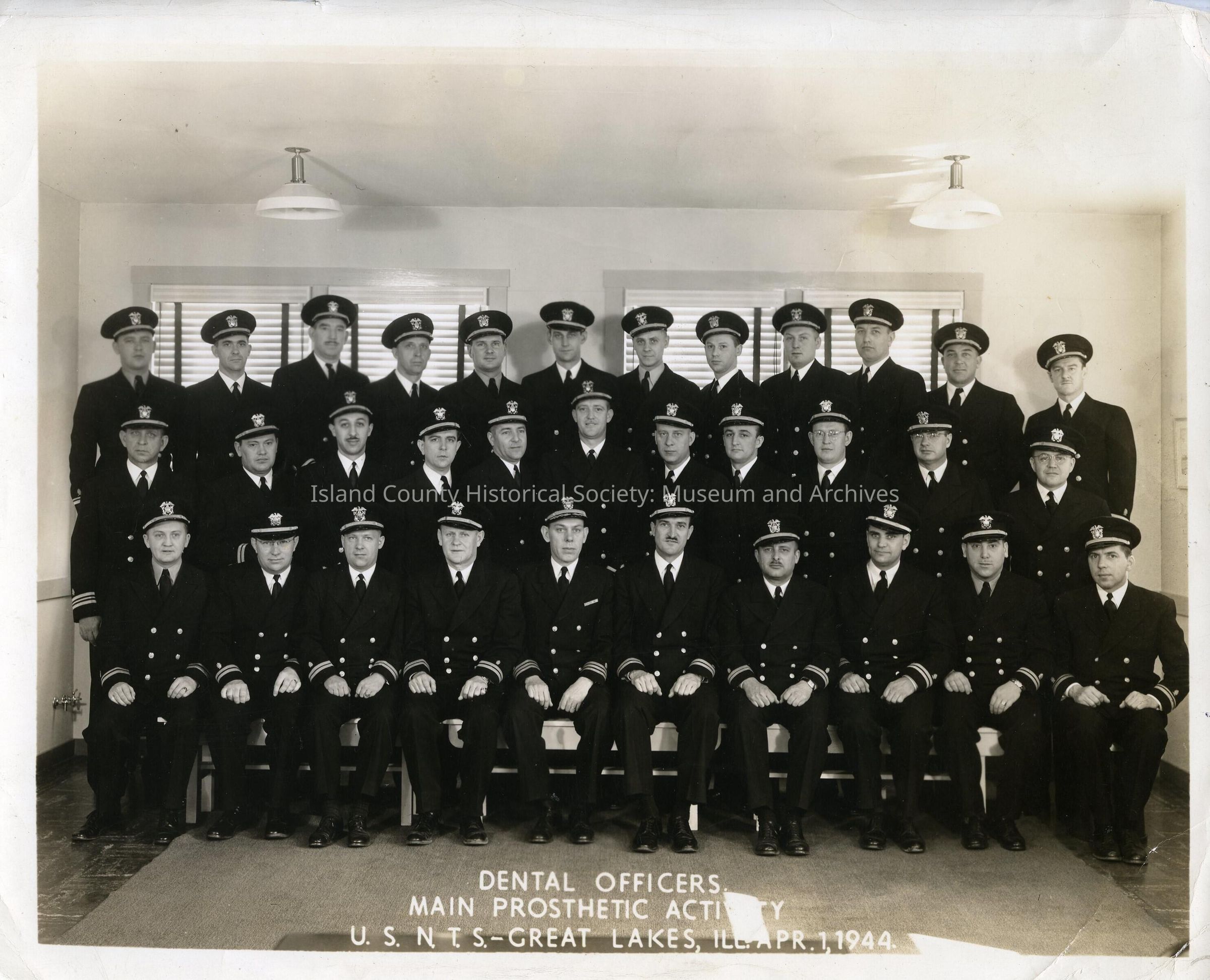Photograph of men in naval uniform. Written on the bottom of the photo: "Dental Officers, Main Prosthetic Activity U.S.N.T.S. - Great Lakes, Ill, Apr, 1944." Written on the back: "Capt R.M. Blackwood Row 1 - Seat 3 (Lieutenant at the time)" (See 2015.065.002 - sailboat)Made/Created
