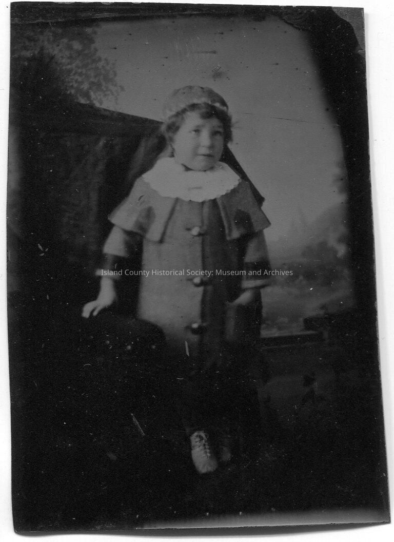 Tintype of a little girl in a hat, short-caped coat, light lacy wide collar over the coat. There are dark bands decorating the lower sleeves and the same material used vertically near the front part of each side of the short cape. There are three large buttons down the front.
