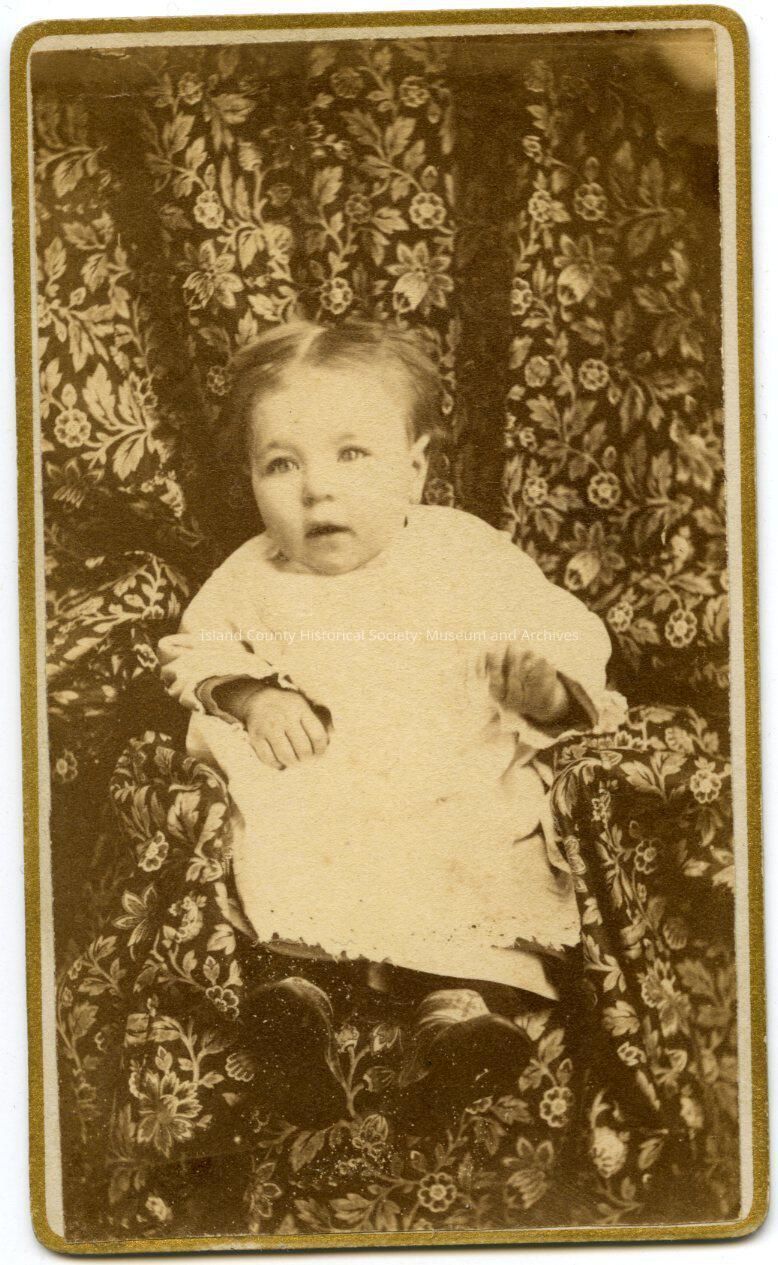 Photo on cardboard of a little child, perhaps a girl, seated in a chair with floral drapery all over it as a backdrop. The child is wearing a light dress with perhaps another dress underneath. Also wearing shoes.