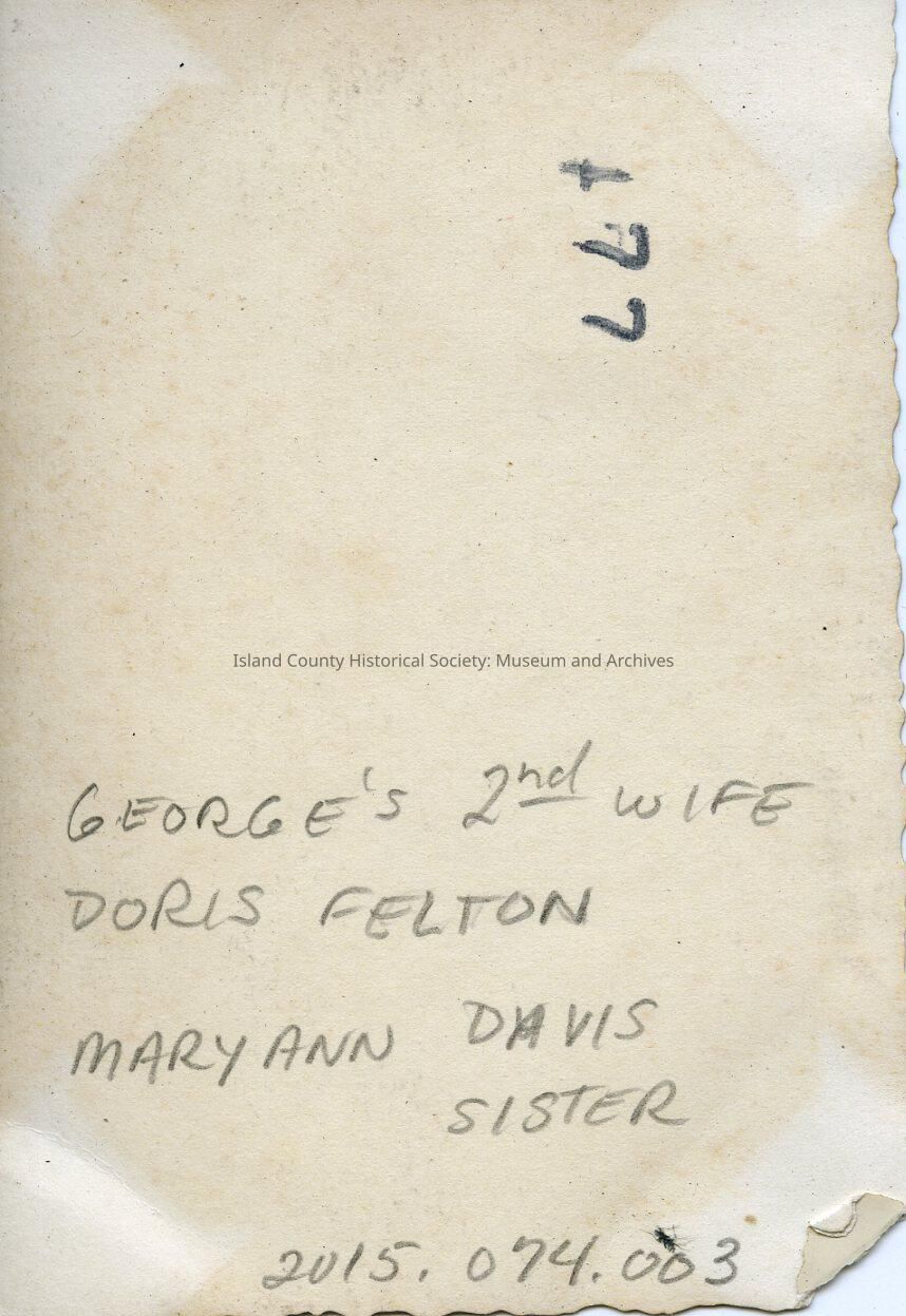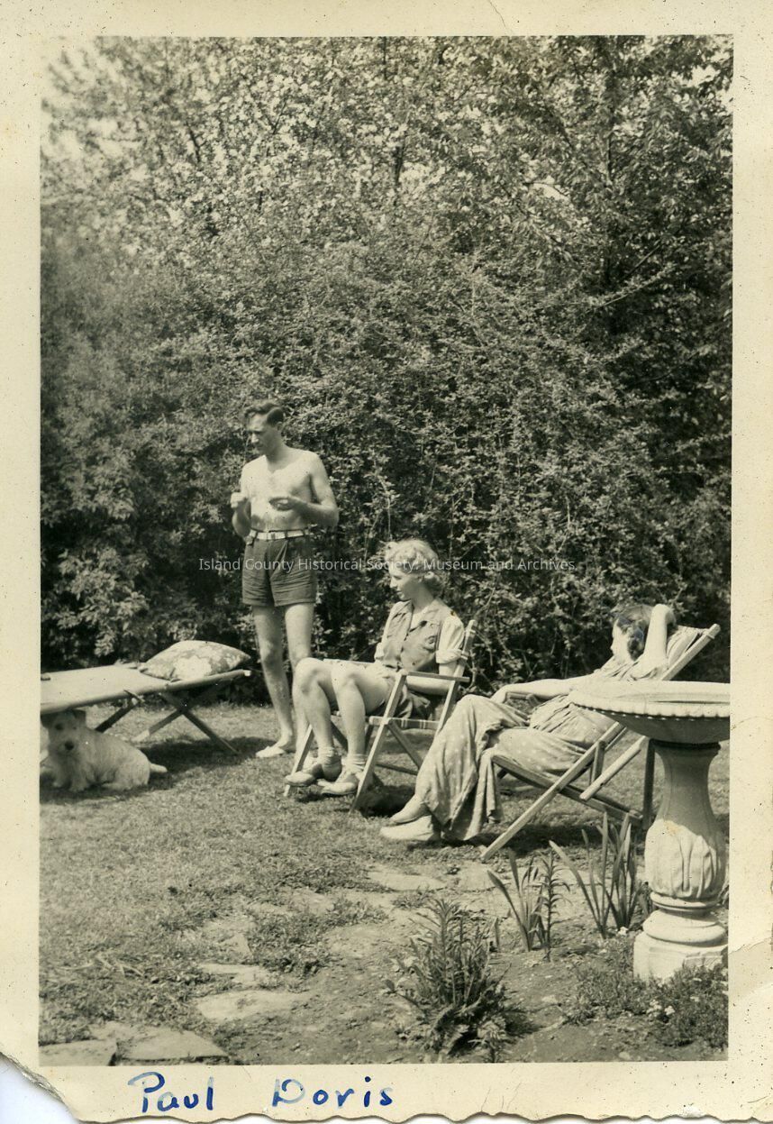 Photograph of a light-haired woman sitting in a lawn chair; man standing heside her in a swimsuit, woman on her other side wearing a long skirt, sitting in a beach chair. Dog sitting under a cot. Bird bath in foreground. Caption: Paul Doris. Written on back: "George's 2nd wife, Doris Felton, Mary Ann Davis. Sister."