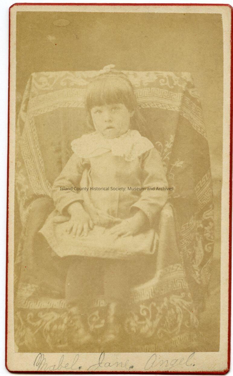 Photo on cardboard of a little girl, seated in a chair with a patterned drapery all over it as a backdrop. The girl is wearing a dress with a wide collar, tights and high-top shoes. On the bottom of the photo is written: Mabel Jane Angel.