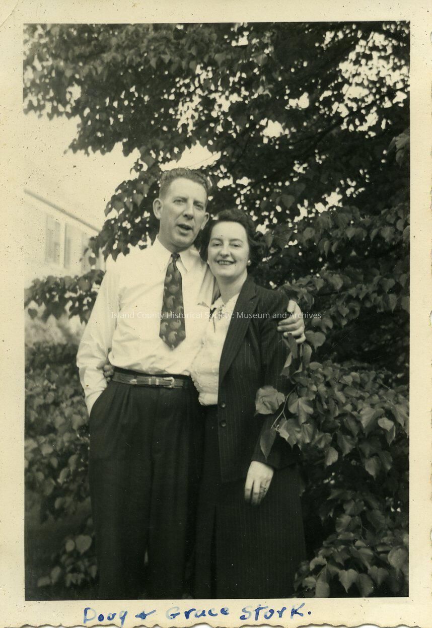 Photograph of a couple, he is wearing shirt, trousers and tie; she has on a suit. Standing in front of a tree. Caption: Doug & Grace Stork.