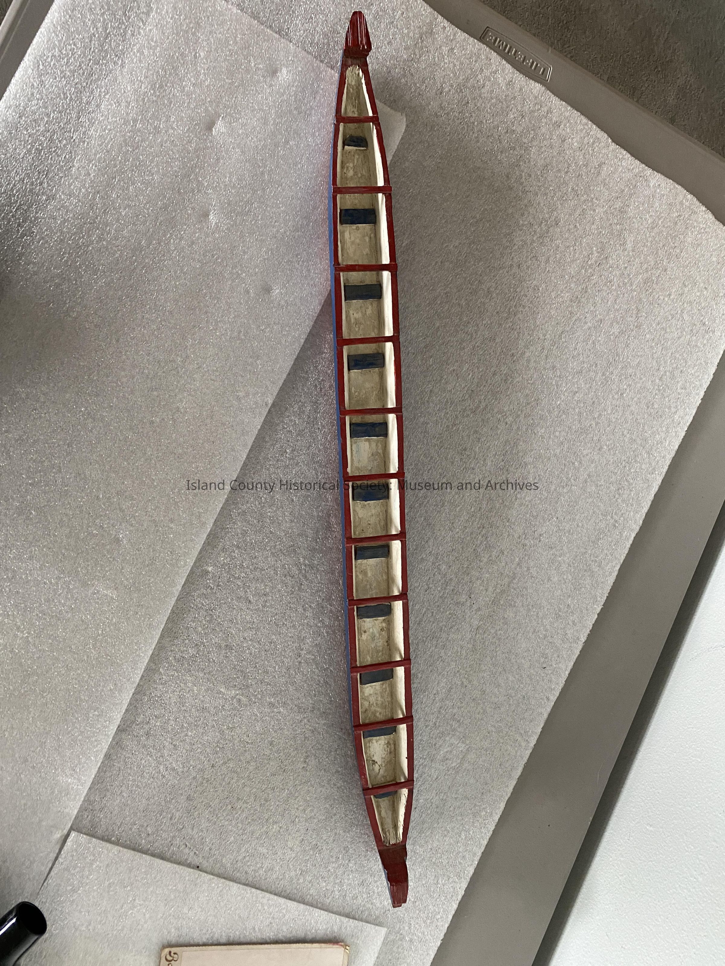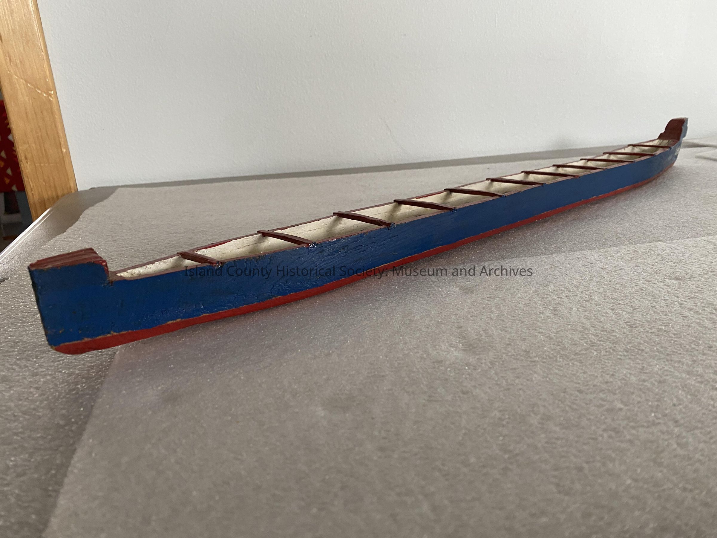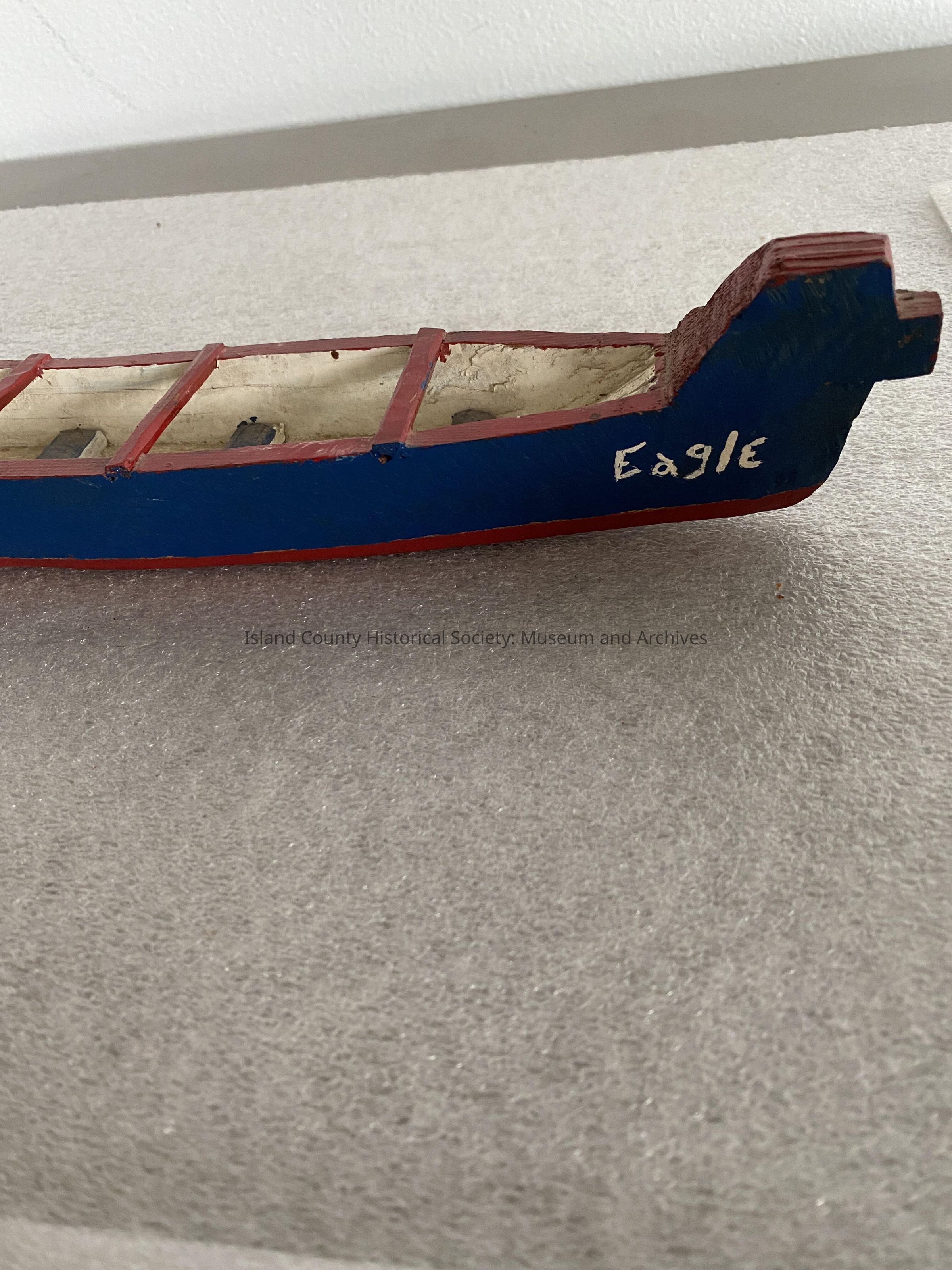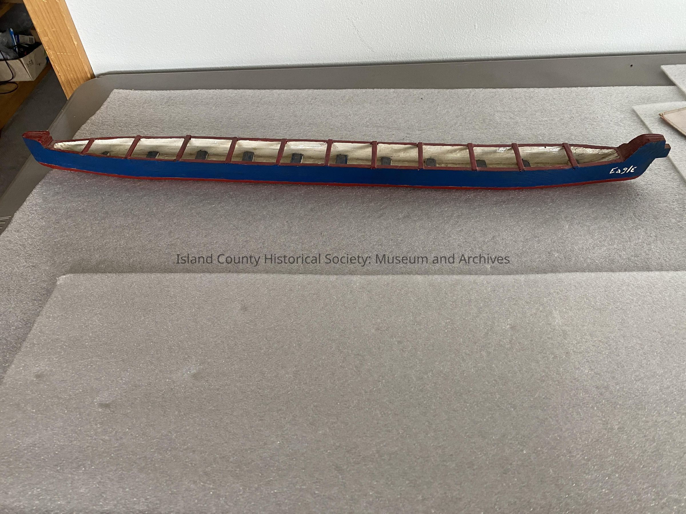 Wooden canoe model-purchased at garage sale 2006. Owners knew nothing about history. The canoe is blue, red and white with “Eagle” painted on the side