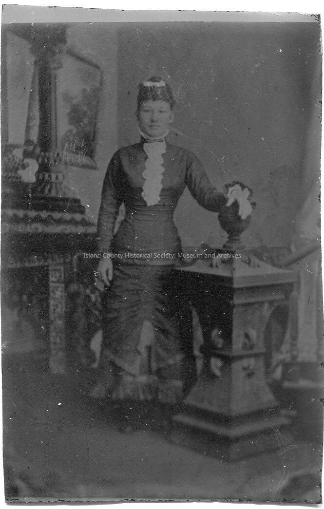Tintype of a young woman in a room or studio, left hand resting on globe or small round object on an elaborate square stand. She is wearing a two-peice outfit, draped skirt with ruffles, lace jabot with a very high neck, lace at her sleeves and a light ribbon, perhaps a bow, on the top of her head.