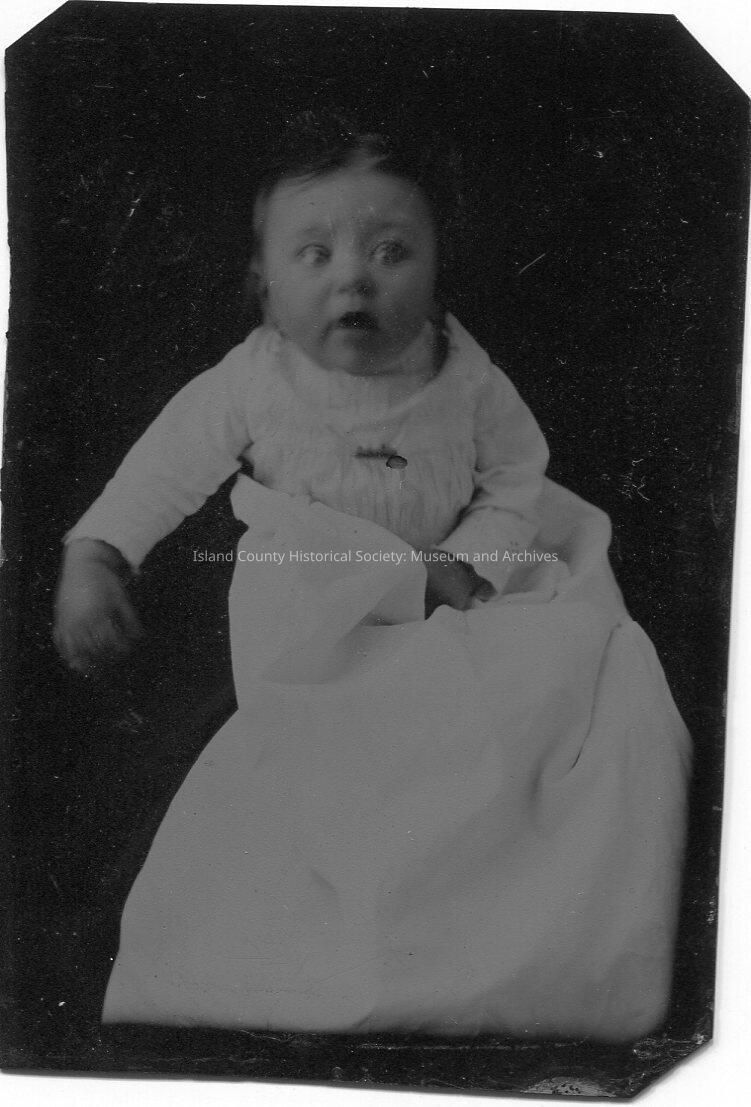 Tintype of baby in a christening gown with perhaps a pin on the front. Looks like the baby and gown are tucked into a large sack to keep warm. The baby has very large eyes.