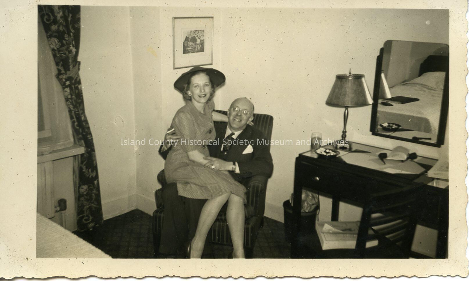 Photograph of a man wearing glasses, in a suit, sitting in an armchair; cigarette in his right hand. Woman in his lap, wearing a dress, and a hat. Desk, chair, mirror - in it can see a bed. Looks like the same room as in 2015.074.005 and 2015.074.007-.009. Large book on the chair. George KelloggMade/Created