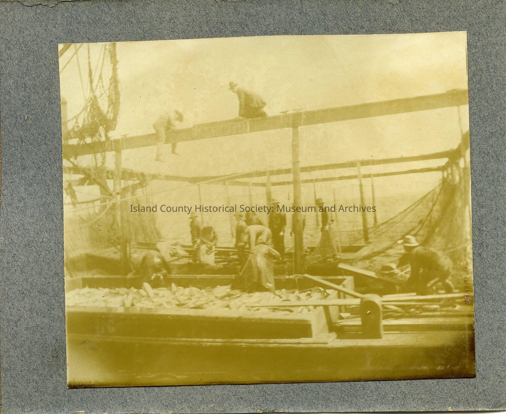 Image shows13 people on a fishing boat. There are a couple of large fishing nets in the background and there is also a large part of the boat filled with fish. Picture obtained from Photo Book collected by Lem Wanamaker and given by Herman Wanamaker.