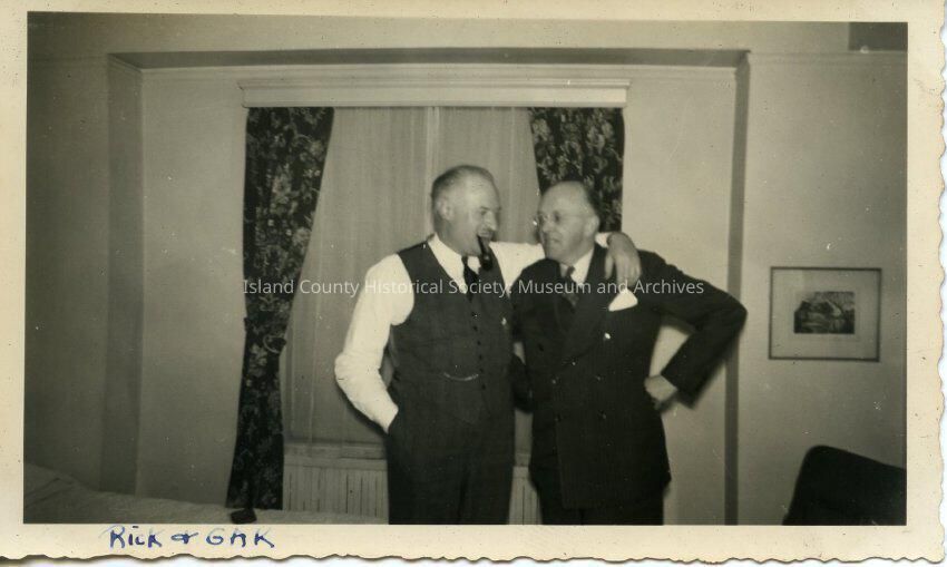 Photograph of a man. arms akimbo, wearing glasses, in a suit, beside a man wearing a suit minus the jacket, smoking a pipe, has a watch fob, who has his arm over the first man's shoulders. Looks like the same room as in 2015.074.005-.009. Picture on the wall. Window with drapes, sheers. Caption: Rick & G.A.K.Made/Created