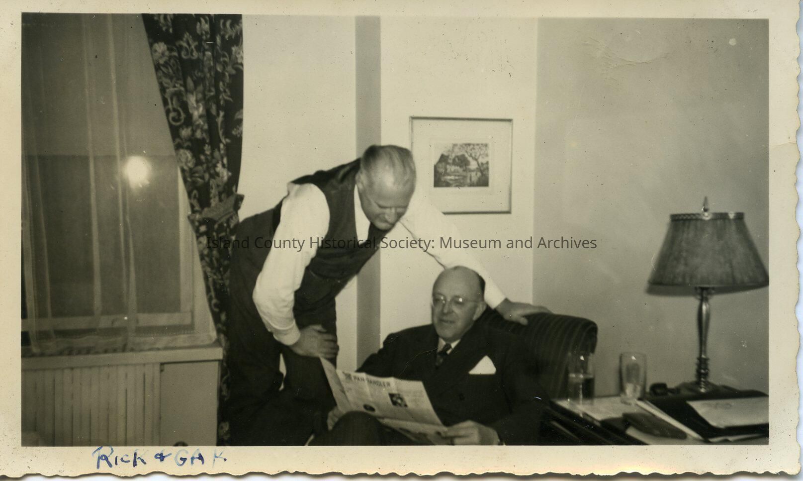 Photograph of a man, wearing glasses, in a suit, reading a newspaper, sitting in an armchair, beside him, leaning over is a man wearing a suit minus the jacket. Looks like the same room as in 2015.074.005-.009. Picture on the wall, lamp and two glasses of liquid on the desk. Window with drapes, sheers. Caption: Rick & G.A.K.Made/Created