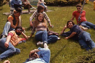 Filming of 1982 film "Cry For The Strangers" in Coupeville, WA. Seven actors relax on lawn.