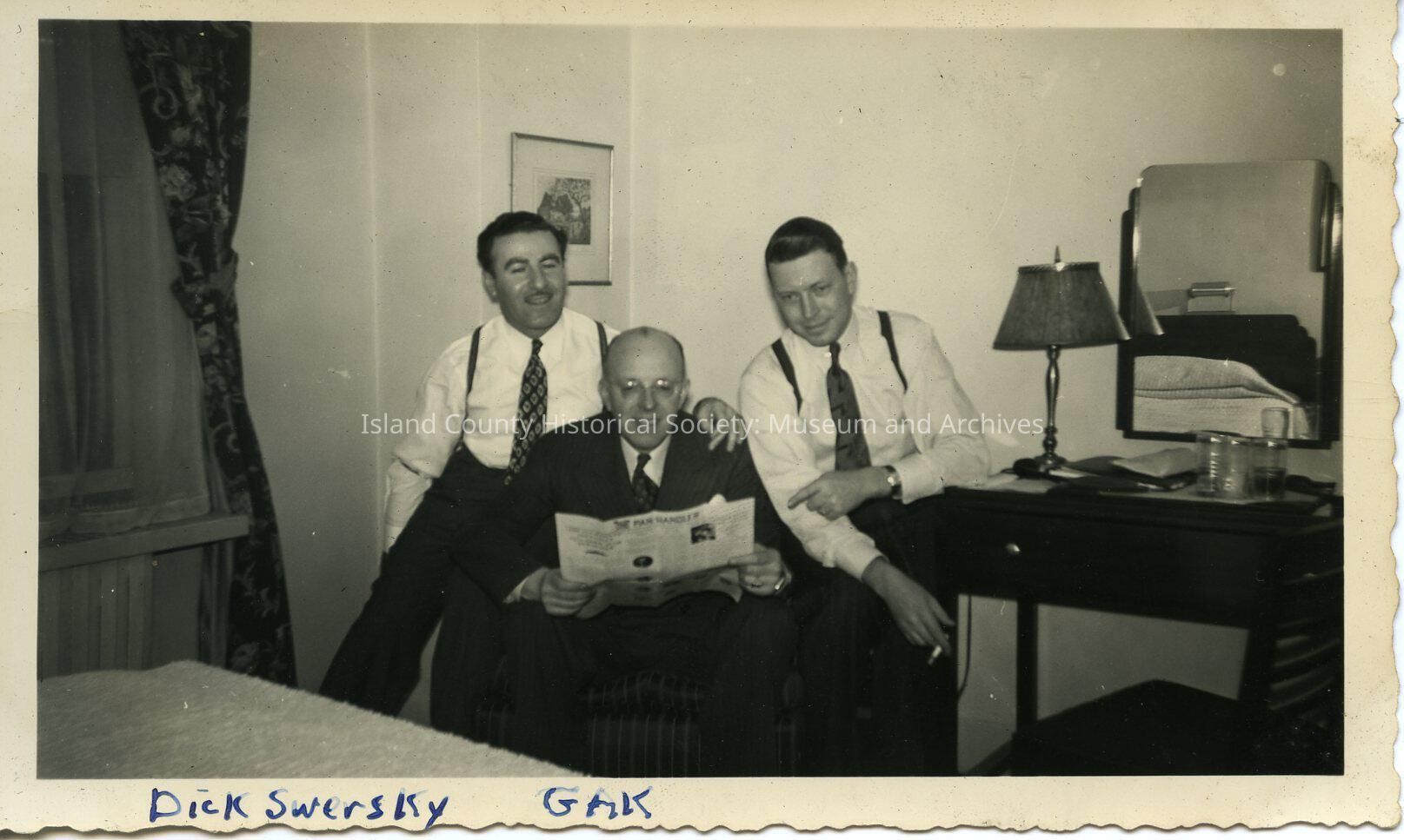 Photograph of a man, wearing glasses, in a suit, reading a newspaper, sitting in an armchair, beside him, on each side are two younger men in trousers, shirts, ties and suspenders the one on the man's left with a cigarette in his right hand. Looks like the same room as in 2015.074.005-.009. Picture on the wall, lamp and three glasses of liquid on the desk. Mirror, bed. Window with drapes, sheers. Caption: Dick Swersky & G.A.K.Made/Created