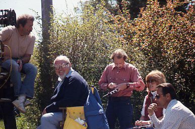 Filming of 1982 film "Cry For The Strangers" in Coupeville, WA. Director and crew relax outdoors.