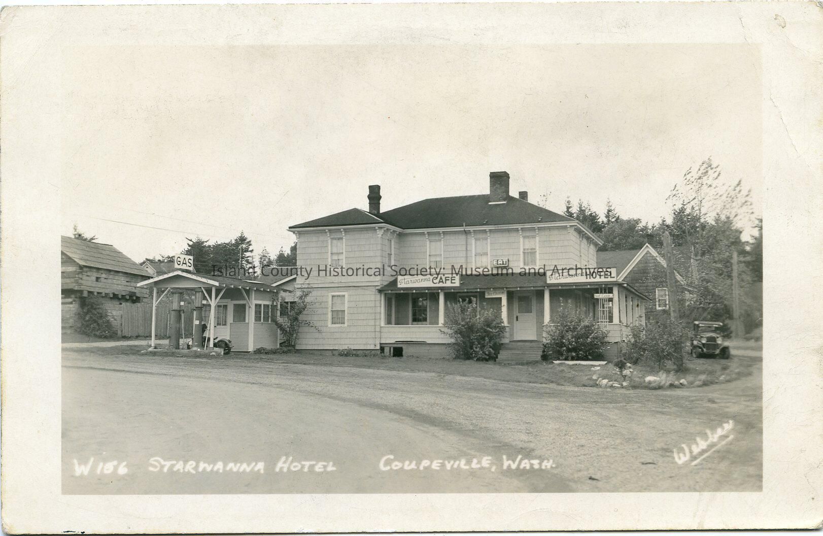 Postcard of the Starwanna Hotel showing gas pump with a sign over the covered area, and Alexander blockhouse. Hotel is two stories, at least three chimneys, two signs - hotel and cafe. Caption: "W156 Coupeville, WA. " An old car is on the right beside the hotel.