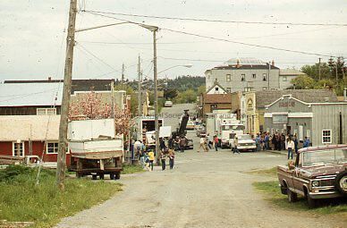 Filming of 1982 film "Cry For The Strangers" in Coupeville, WA. Front Street looking east. Film trucks and people are visible.