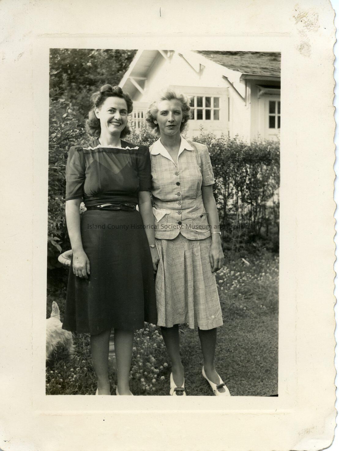 Photograph of two women in front of possible a garage/shed, wearing dresses. Part of dog visible on left of photo. Same women in 2015.074.018-.019 and .023-.024.