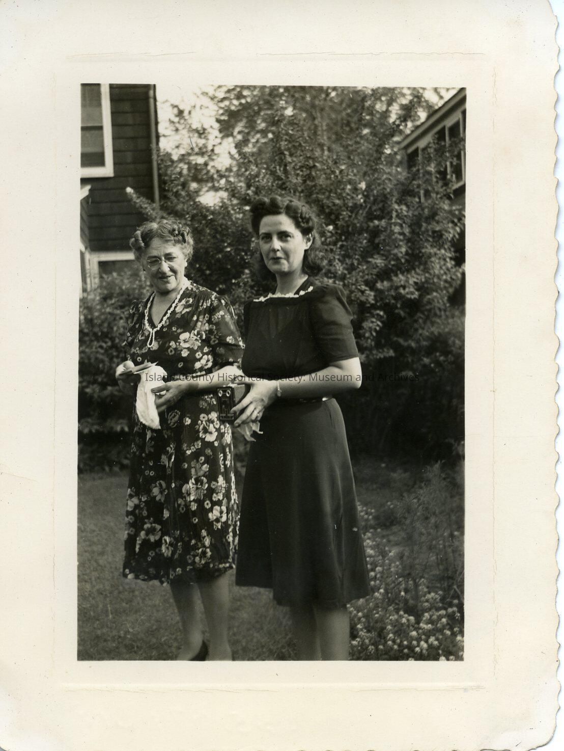 Photograph of two women in front of a house, wearing dresses. Woman on the right is holding a Brownie camera. Woman on left is holding a handkerchief and maybe photos, she is wearing glasses. Same women as in 2015.074.017 -.019, .023-.024. Same photo as 2015.074.024.Made/Created