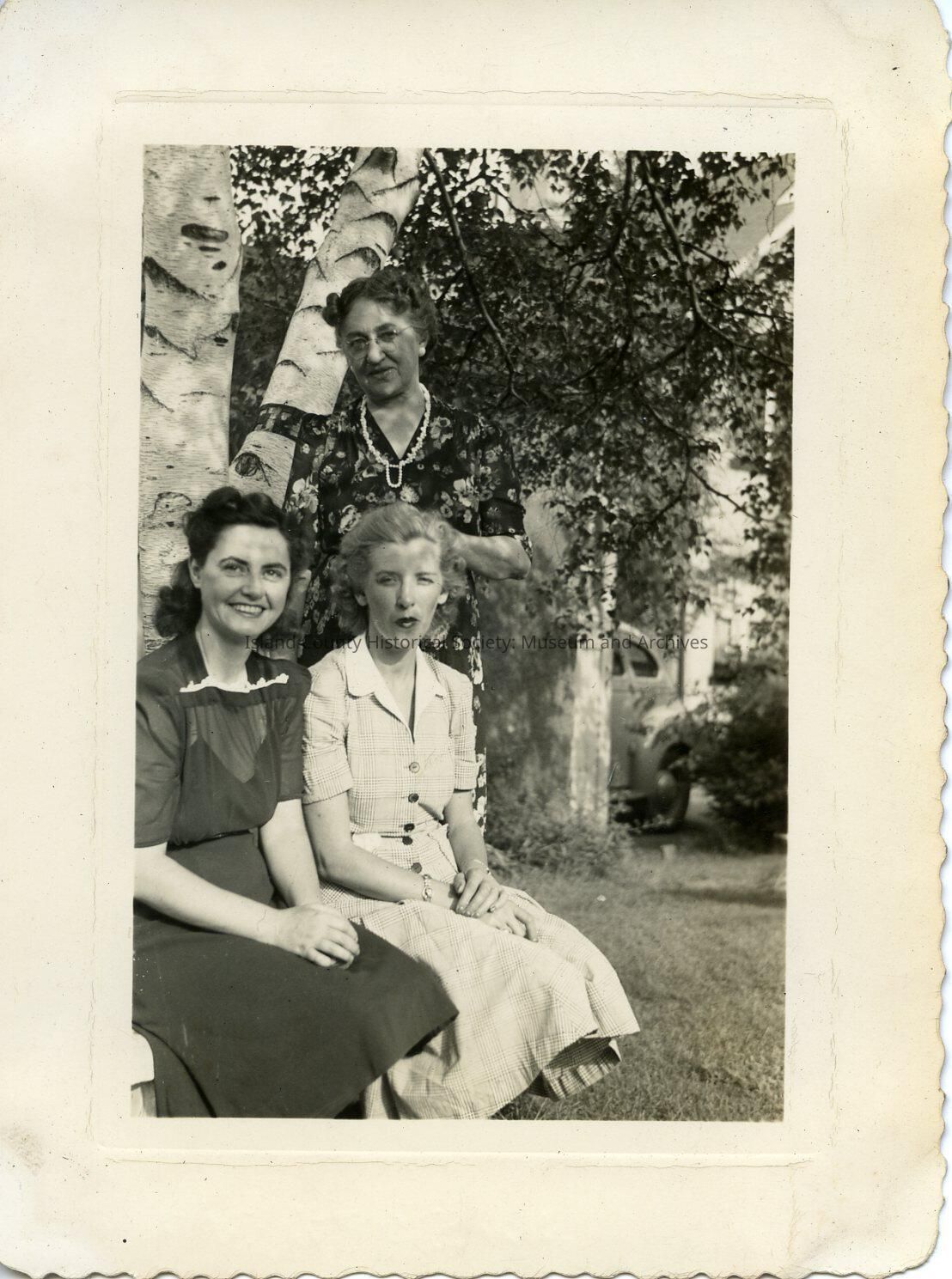 Photograph of three women in front of some trees (birch), wearing dresses. Same as 2015.074.017-.018 and .023-.024. Two younger women sitting on a bench. Older woman is wearing glasses.