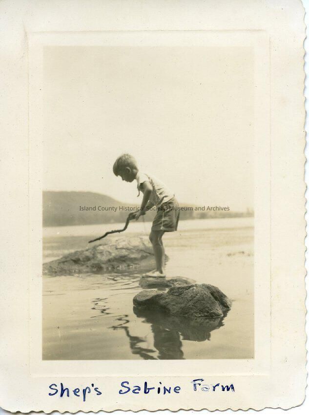 Photograph of boy on a stone at a lake or shore. Holding a stick. Shorts and t-shirt. Caption: Shep's Sabine Farm. See 2015.074.020 and .022.