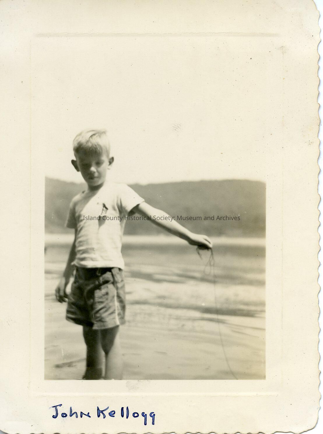 Photograph of boy at a lake or shore. Holding a string Shorts and t-shirt. Caption: John Kellogg. See 2015.074.020-.021.
