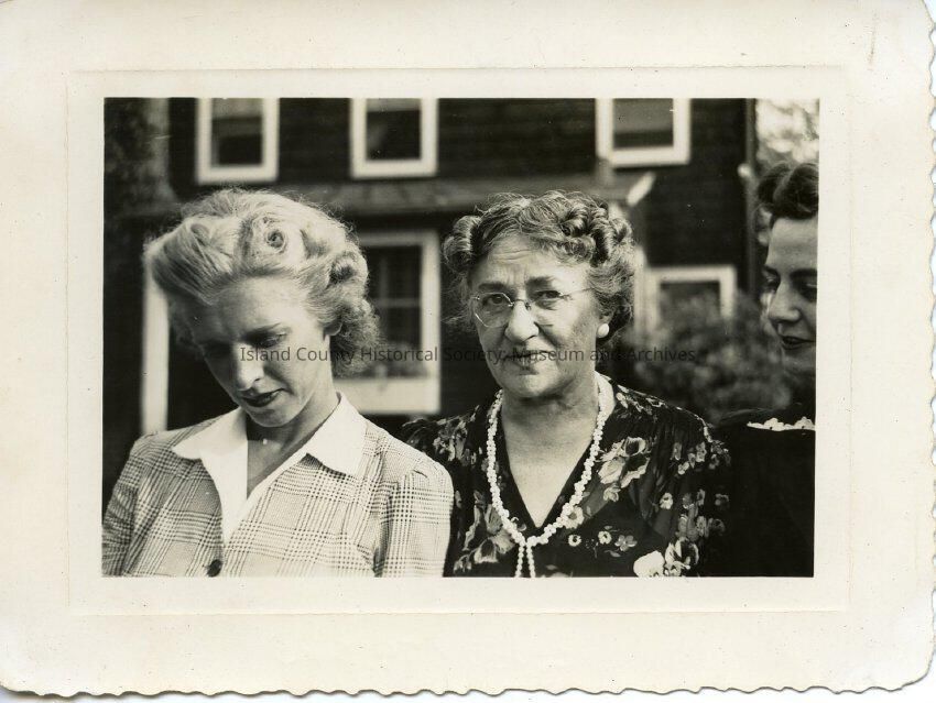 Photograph of three women in front of a house, wearing dresses. Same as 2015.074.017-.019 and .023-.024. Older woman is wearing glasses.