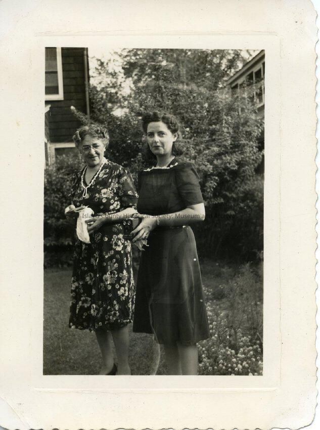 Photograph of two women in front of a house, wearing dresses. Same photo as 2015.074.018. Same women as 2015.074.017-.019 and .023-.024. Older woman is wearing glasses.