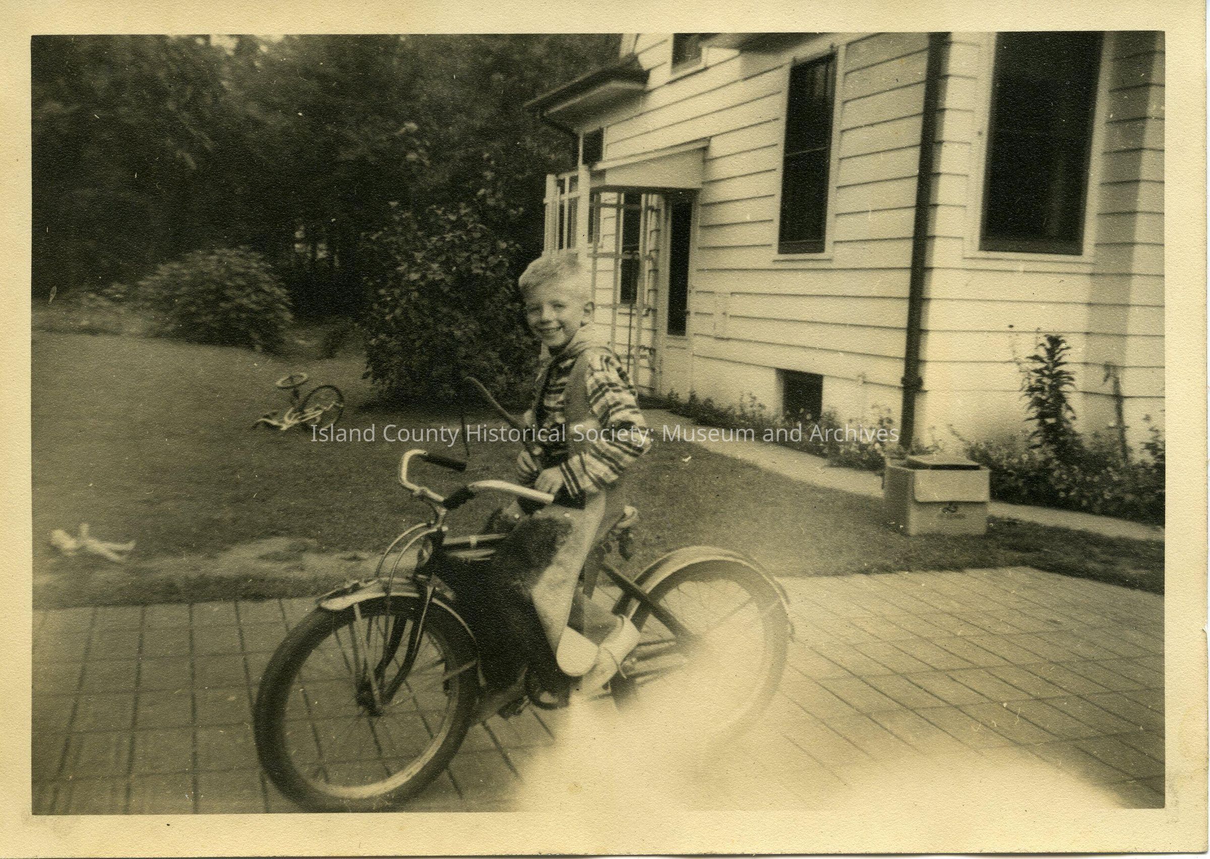 Photograph of boy on a bicycle, wearing a cowboy outfit, on birck driveway, front of the house, on the lawn are a large doll, a big box and a tricycle on its side.Made/Created