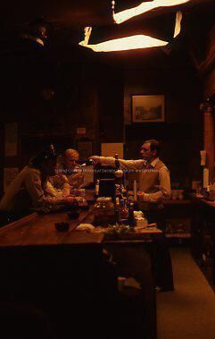 Filming of 1982 film "Cry For The Strangers" in Coupeville, WA. Inside tavern on Front Street. Actor dressed as police officer sits at bar while bartender pours drink for another customer.
