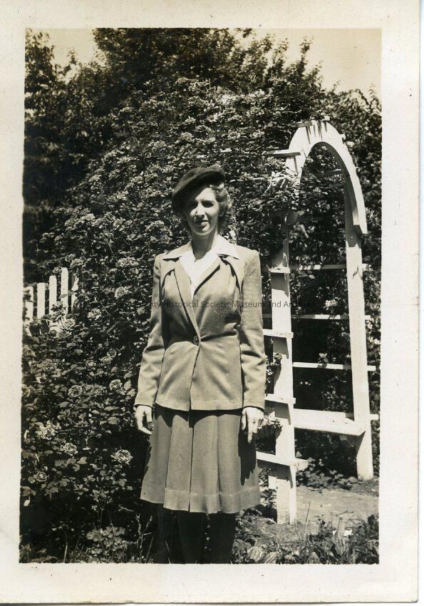 Photograph of a woman in a suit, pleated skirt and hat, in front of an arbor. Same woman in 2015.074.027, and arbor in .028.