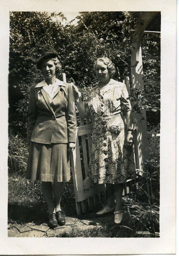 Photograph of a an older woman in a dress and a younger woman in a suit, pleated skirt and hat, in front of an arbor, garden gate. Latter, same woman in 2015.074.026, and arbor in .028.Made/Created