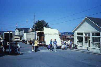 Filming of 1982 film "Cry For The Strangers" in Coupeville, WA. Looking down Front Street from Main Street intersection. Large reflective screen and equipment vehicles. Crowd on sidewalk.