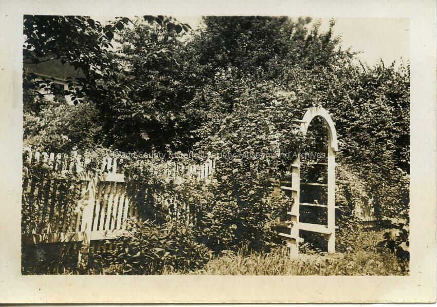 Photograph of an arbor, and garden fence, same arbor as in 2015.074.026-.027