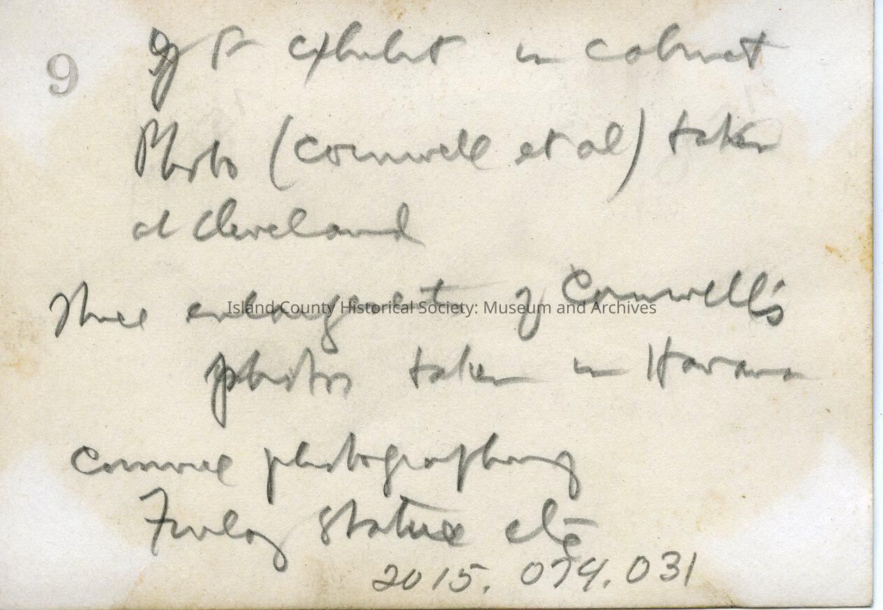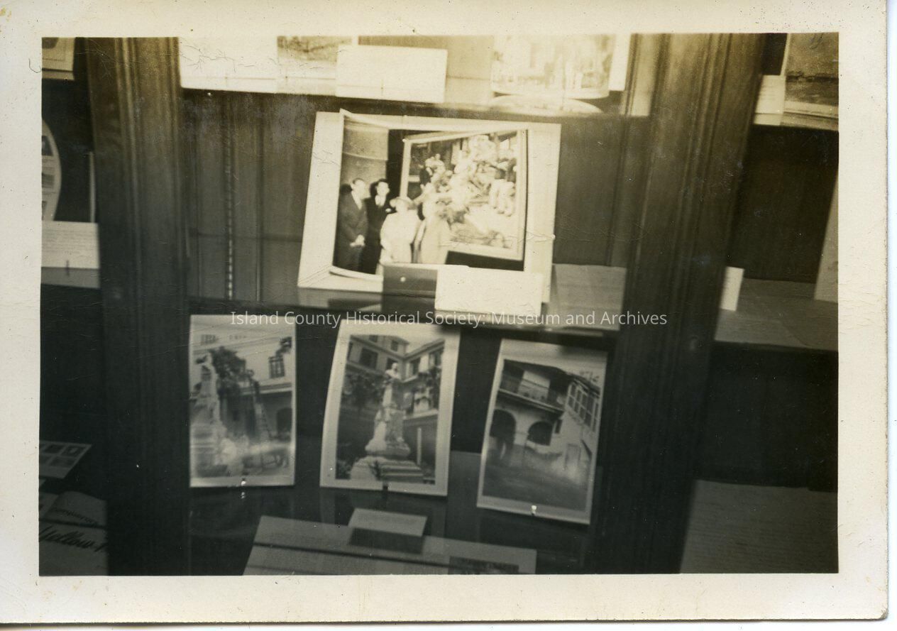 Photograph of an office with a wood wall cabinet. Pictures in the cabinet. Written in pencil on the back: "Y F (yellow fever) exhibit in cabinet. Photo (Carroll et at) taken at Cleveland. Nice Carrell photographing Finlay statue etc." Related to 2015.074.029--034. Other photos state state these are at the Mayo Clinic.