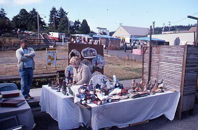 Booths set up along Front Street near Grace Street for Coupeville Arts and Crafts Festival. Woman works at table; man stands on sidewalk behind.
