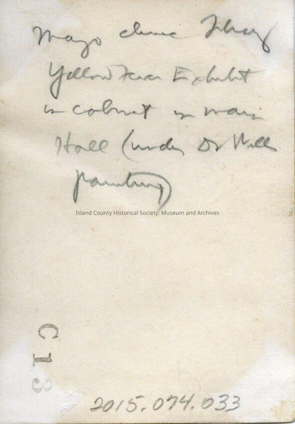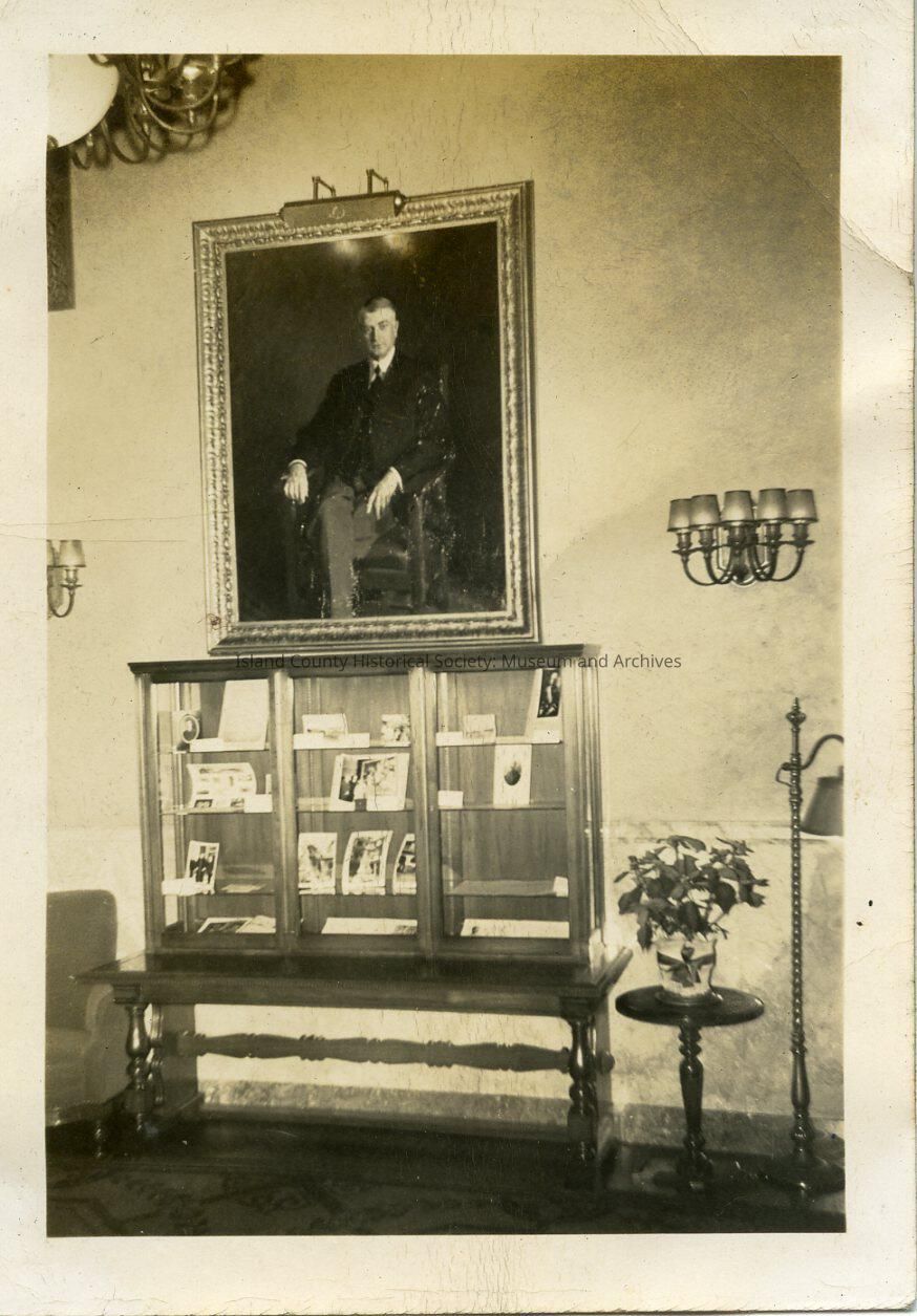Photograph of an office with a wood wall cabinet. Large portrait over the cabinet. Written in pencil on the back: "Mayo Clinic Library. Yellow Fever Exhibit in cabinet in main hall *under Dr. (?) painting)" Related to 2015.074.029--034. Other photos state state these are at the Mayo Clinic.
