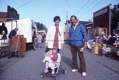 Booths being set up along Front Street for Coupeville Arts and Crafts Festival. Bill Evans, chairman of festival, poses with fellow teacher Sharon Joy Bardwell and young daughter in stroller.