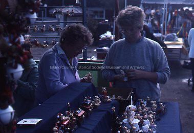 Booths being set up along Front Street for Coupeville Arts and Crafts Festival. Two vendors arrange small objects.