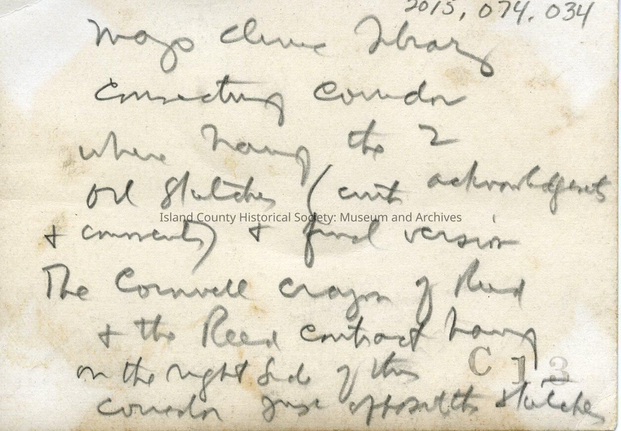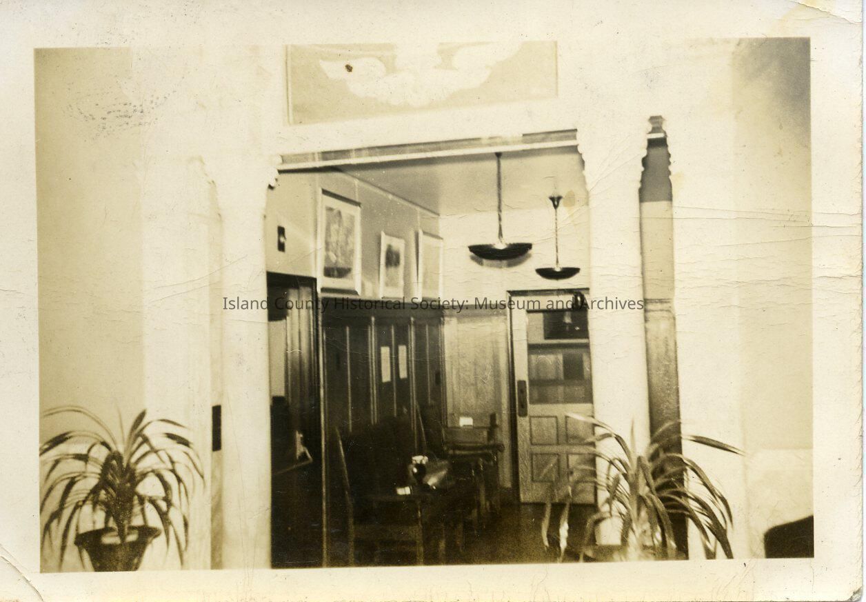 Photograph of a room with a wood wall cabinet., outside are two columns and two large plants beside the doorway. Pictures over the cabinet. Written in pencil on the back: "Mayo Clinic Library. Connecting Corridor where hang the 2 ore ? statues (with acknowledgements & comments) & final version. The Carroll crayon of Reed & the Reeed contract hang on the right side of the corridor just oppostie statue." Related to 2015.074.029--034. Other photos state state these are at the Mayo Clinic.