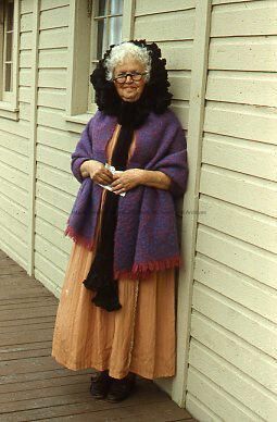 Coupeville Squash Festival. Woman in old time dress poses outside Coupeville Rec Hall.