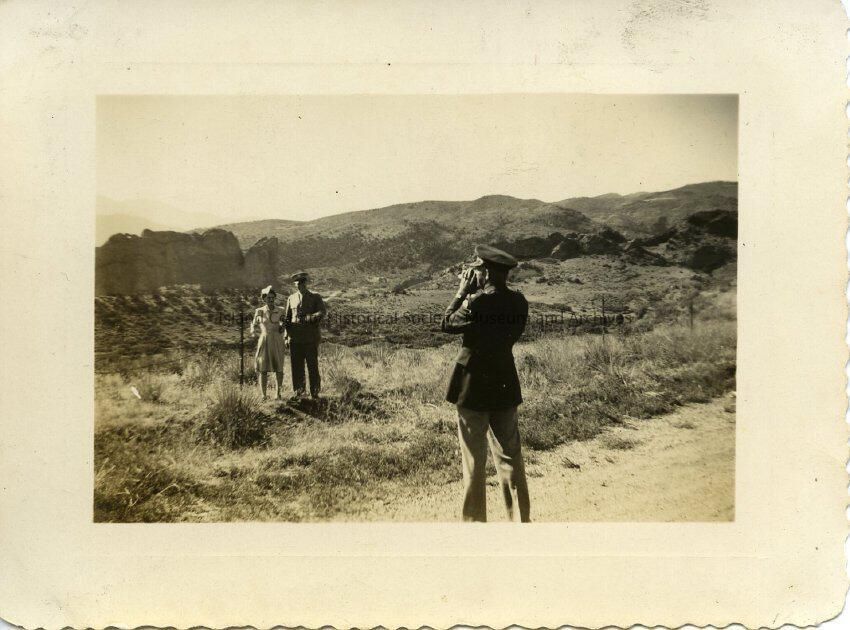 Photograph of two men in army uniform (cannot see the rank), with a couple - she has a dress and hat. They are in a desert area with large boulders in the background. One man in uniform is taking a photo of the woman and the other man in uniform. Photo stamp on the back: Oct 5 1942.