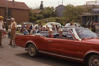 Coupeville Squash Festival parade. Ed and Jean Sherman as Squash King and Queen ride in convertible on Front Street.