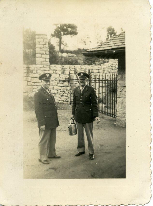 Photograph of two men in army uniforms (cannot see the rank). They are standing in front of an metal gate, stone walls. One is carrying a garden watering can. Photo stamp on the back: Oct 5 1942. From the insignia they are likely majors or Lt Col's and doctors. Man on right is Lt. Col. Howard Butters Kellogg. 1942