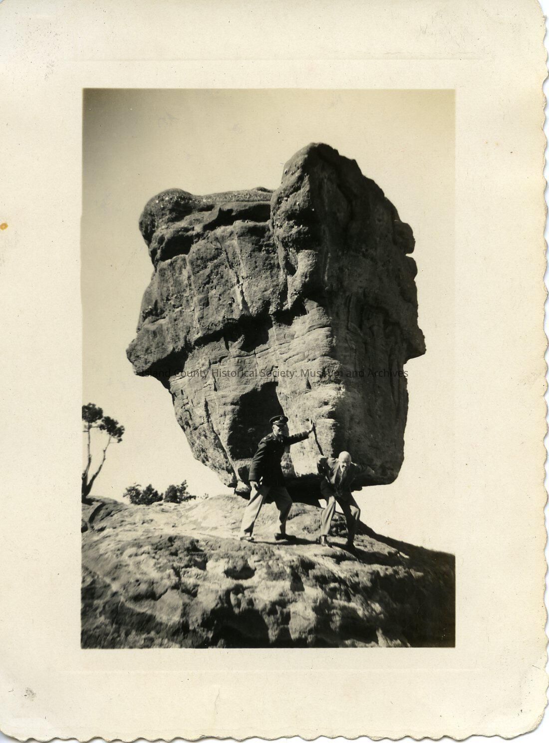 Photograph of a man in army uniform, wearing glasses, either a major or Lt Col. Probably a doctor. A man wearing a suit. Both posing as if holding up a balancing rock. Photo stamp on the back: Oct 5 1942. Man is Lt. Col. Howard Butters Kellogg