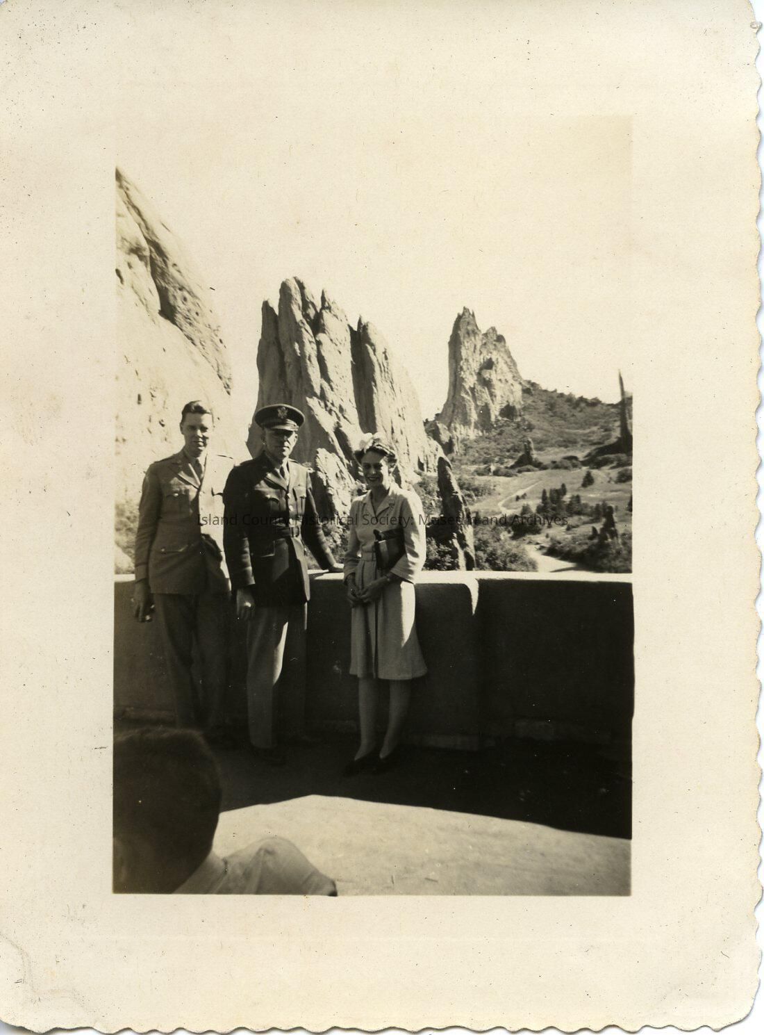 Photograph of two men in army uniform, one wearing glasses, cannot see rank, but both probably doctors. Woman beside them. Scenic viewpoint. Photo stamp on the back: Oct 5 1942. Man is Lt. Col. Howard Butters Kellogg