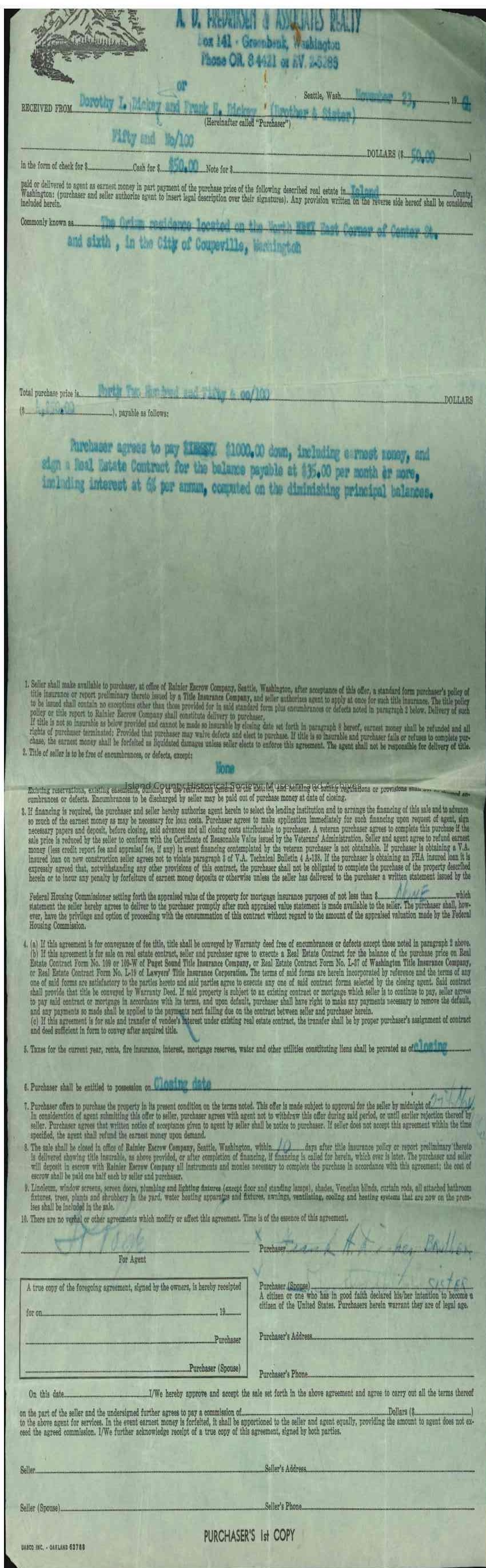 Purchaser's copy of a payment of $50.00 cash on "The Grimm residence located on the North East Corner of Center St. and sixth, in the city of Coupeville, Washington," received from Dorothy and Frank Dickey.Collection