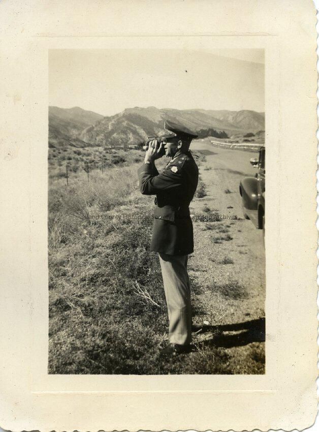 Photograph of a man in army uniform - major or LtCol, taking a photo or a movie with small camera, standing beside the road. Photo stamp on the back: Oct 5 1942. Man is Lt. Col. Howard Butters Kellogg